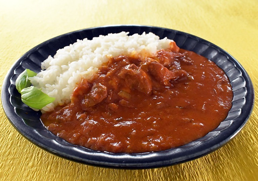 バターの香り、鶏肉の旨み、あま~くてとろとろの玉ねぎのコクが引き立つ濃厚ソースにたっぷりのトマトで旨みと酸味をしっかりと効かせました。“トマトたっぷりまいう~製法”で作り上げたバターチキンカレーです。